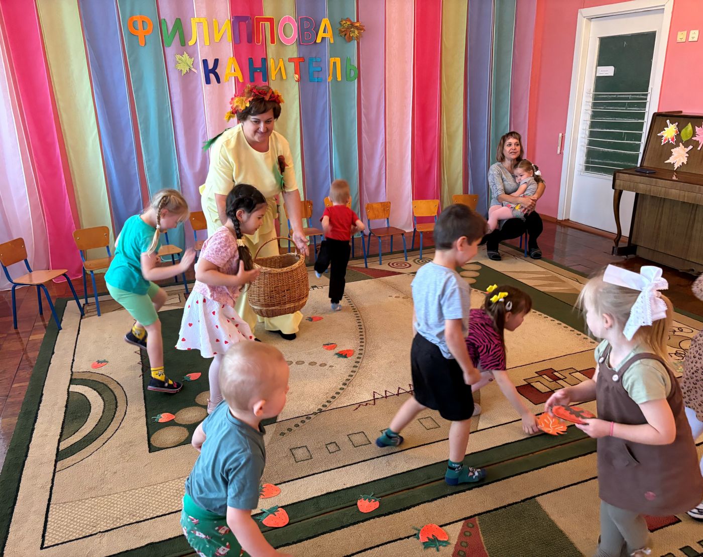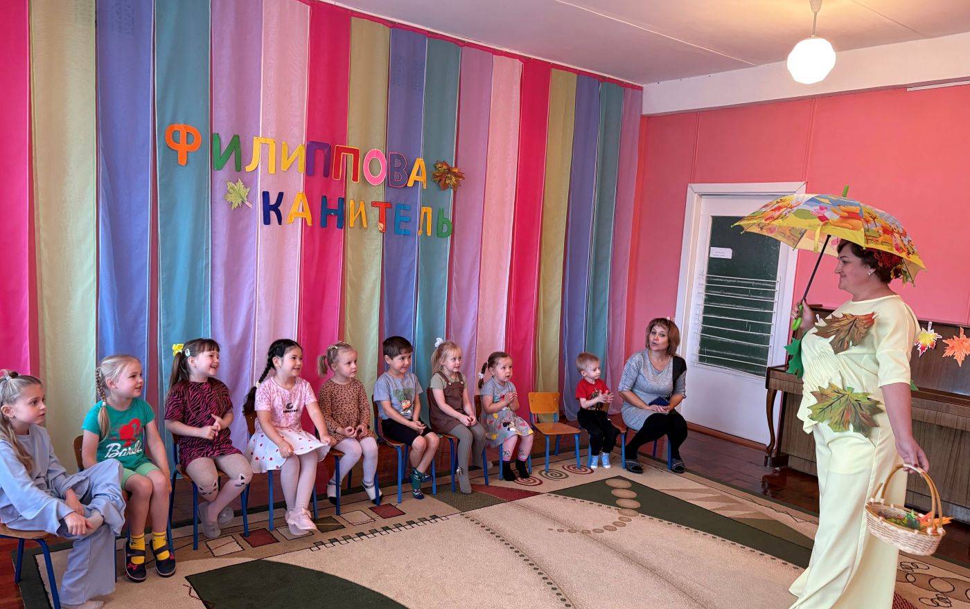 Веселый осенний праздник «Филиппова канитель» провели в детском саду работники СДК. К ребятам в гости пришла Осень и принесла в подарок яркий листопад и настоящую канитель! Ребята узнали об этом празднике много интересного. Они отгадывали загадки, играли в веселые игры, танцевали вместе с Осенью, преодолевали осенние лужи! А в конце программы всех угостили вкусными блинами! Осень попрощалась с ребятами до следующего года.